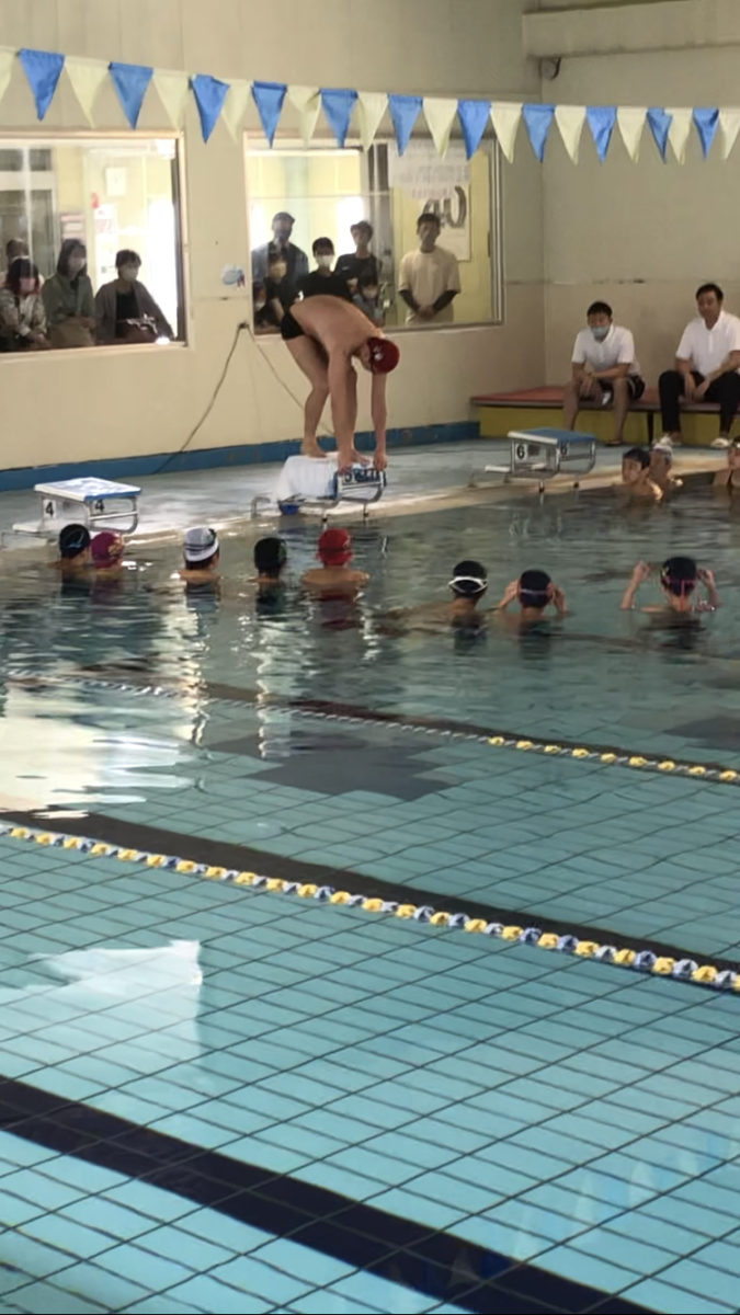 午前の部ではプールの中で模範泳法や飛び込みのポイントなどを分かりやすく教えていただきました。