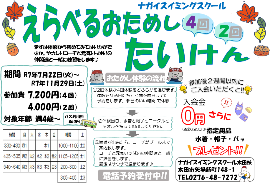 体験後入会をすると!!入会金0円!!水着・帽子・バック!!プレゼント!!