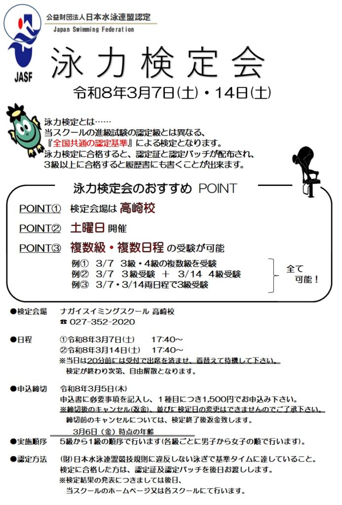 3月7日と14日に泳力検定を実施しますが、まだまだ募集してます!