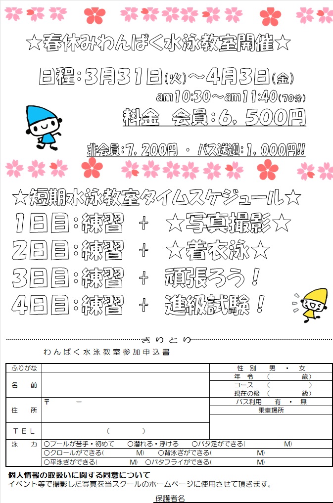 今年の春休みは短期水泳教室を開催しますよ🏊